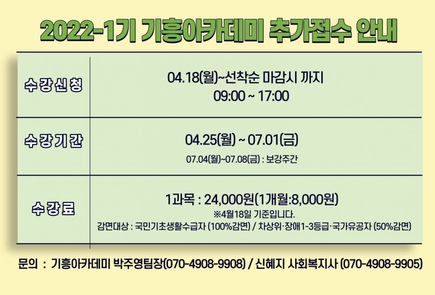 2022-1기 기흥아카데미 추가접수 안내 페이지 정보 작성자 사회복지사 신혜지 댓글 0건 조회 10,928회 작성일 22-04-18 14:34 본문 목록 이전글[지역복지과]22년 5월 물리치료 모집 22.04.27 다음글[기획홍보팀] 경기도 심리방역 집단 "G+ 마음아 안녕, 오늘 안녕!" 22.03.21 댓글목록 댓글목록 등록된 댓글이 없습니다.