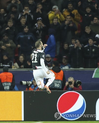 Gonzalo Higuain of Juventus celebrates after scoring a goal during the UEFA Champions League group D soccer match between Bayer 04 Leverkusen and Juventus FC in Leverkusen, Germany, 11 December 2019. EPA/FRIEDEMANN VOGEL