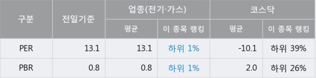 전일 종가를 기준으로 이 종목의 PER는 13.1배, PBR은 0.8배이다. PER는 전기·가스업종의 평균 PER 13.1배와 동일한 수준으로 업종 내에서 하위 1%에 있고, PBR은 전기·가스업종의 평균 PBR 0.8배와 동일한 수준으로 업종 내에서 하위 1%에 위치한다. 보통 낮은 PER는 현재 시장이 해당 기업의 가치를 상대적으로 낮게 평가하고 있다고 해석될 수 있다.