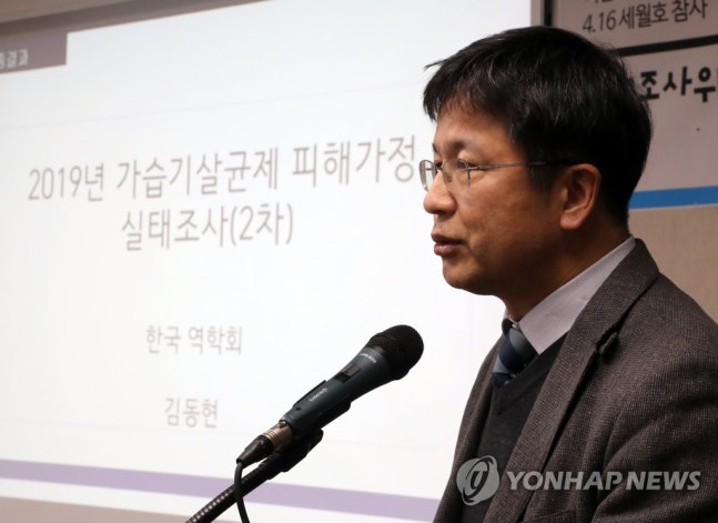 (서울=연합뉴스) 최재구 기자 = 18일 서울 중구 포스트타워에서 열린 가습기살균제 전체 피해가정 대상 첫 조사결과 발표에서 한림의대 사회의학 김동현 교수가 조사내용을 발표하고 있다. 2020.2.18
