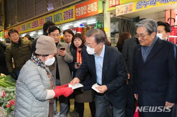 [아산=뉴시스]배훈식 기자 = 문재인 대통령이 9일 오후 충남 아산시 온양온천 전통시장을 방문해 상인들을 격려하고 있다. 2020.02.09. dahora83@newsis.com <저작권자ⓒ 공감언론 뉴시스통신사. 무단전재-재배포 금지.> /사진=뉴시스화상