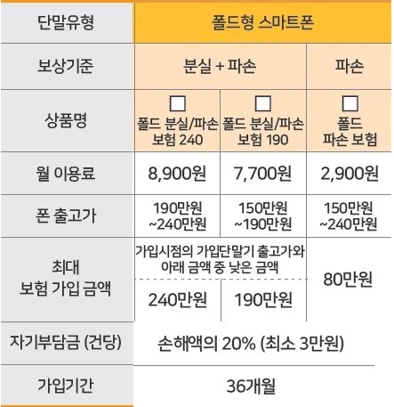 A : 이동통신사마다 보험 상품의 가입 조건이 달라 Z 플립에 해당하는 보험 상품이 없는 경우가 있다. SK텔레콤은 기존 고가 스마트폰을 대상으로 한 보험 가입 조건이 출고가 150만원 이상이어서 Z 플립 고객도 가입할 수 있다. LG유플러스는 20일부터 Z 플립을 위한 보험을 별도로 출시했다. 이에 비해 KT는 Z 플립 고객을 위한 보험이 없는 상태다.
