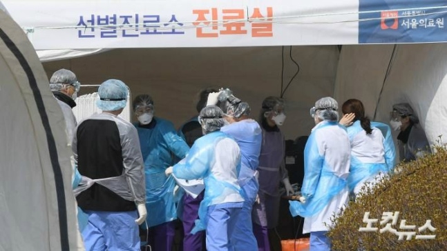 지난 4일 서울의료원 선별진료소(사진=이한형 기자/자료사진)급증하는 환자 수에 비해 저조했던 코로나19 격리해제 증가세가 조금씩 늘어나기 시작했다.대구 이단신천지에서 벌어진 '슈퍼 전파' 국면이 곧 마무리되면 격리해제 추이가 급격히 늘어날 것으로 기대된다.