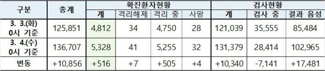 아울러 방역당국의 검사 역량이 확대되는 반면, 새로운 의심환자 발생 추이가 잦아들면서 진단검사 결과를 기다리던 인원도 지난 3일 3만 5555명에서 4일에는 2만 8414명으로 7141명 줄었다.