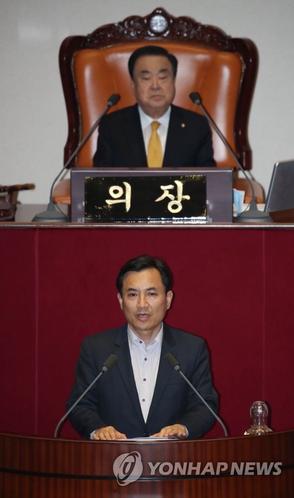 (서울=연합뉴스) 김인철 기자 = 미래통합당 김진태 의원이 7일 오전 국회에서 열린 본회의에서 공직선거법ㆍ정치자금법 일부개정법률안에 대해 토론하고 있다. 2020.3.7