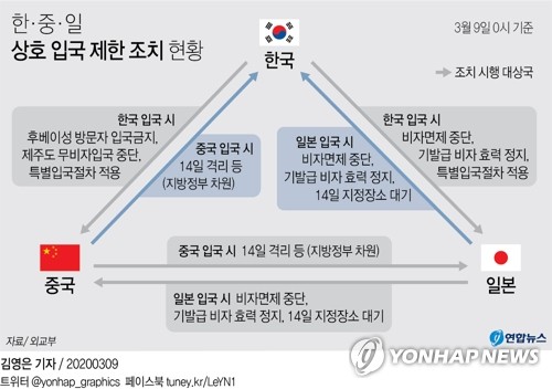 (서울=연합뉴스) 김동현 기자 = 한국과 일본이 신종 코로나바이러스 감염증(코로나19) 대응을 이유로 상대방에 대한 입국규제를 강화하면서 9일부터 양국 간 이동이 전면 통제된다.